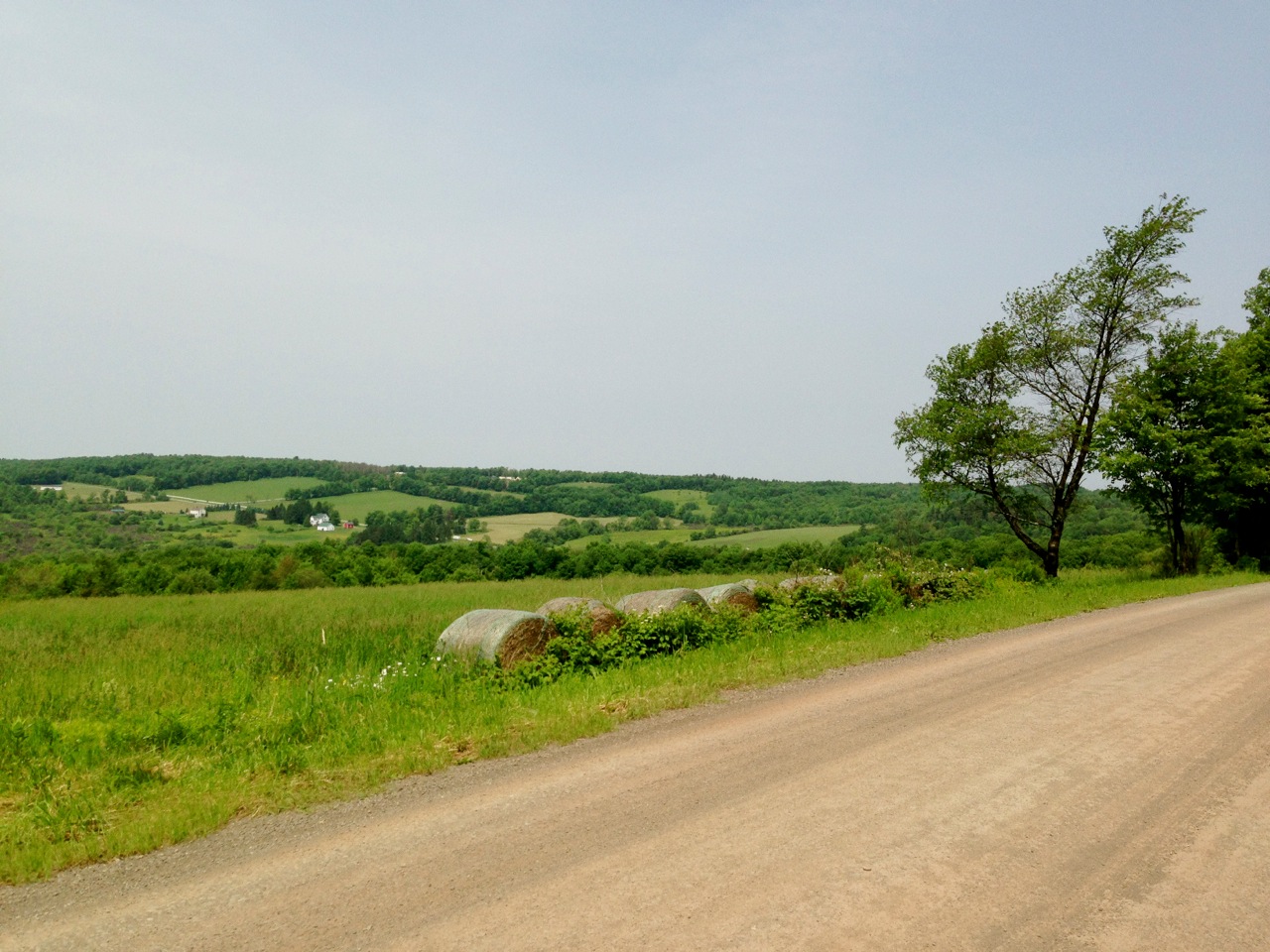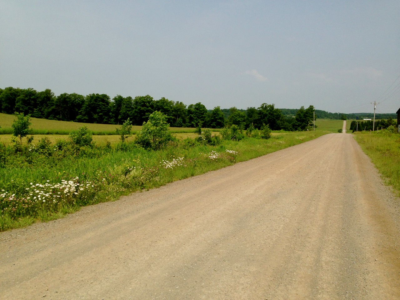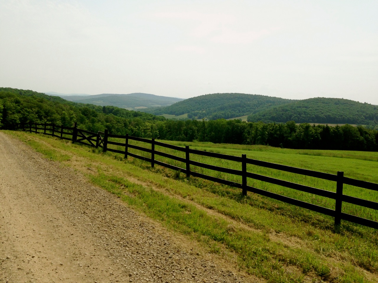Continuing on Turnpike Rd past West Kortright, I’m brought to the final and steepest climb of the route, a short loop up Davis Rd, a gorgeous wood fence-lined dirt road dominated by a vary large dairy farm. On one side, cows take shelter from the sun under a cluster of shade trees in an otherwise vast pasture. On the other side, hilltops occupy the distant horizon. This road challenges the traction limits of my 650B Hetres, with a 20% peak grade on large, loose gravel. No chance of pedaling out of the saddle without loosing traction, and I don’t even think about stopping for photos, figuring I won’t regain traction. When I arrive at the top, the views are breathtaking; good time for a break.