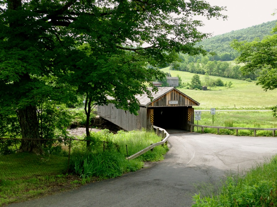 From here the second half of the route switches gears (literally and figuratively) and takes on an entirely different character, becoming less physically demanding. Elk Creek Rd winds along a valley nestled between two steep hills, with gentle rollers and an overall slightly negative grade, a relief from the hard climbing that marked much of the first half of the ride. It brings me Rt 10, a state highway with a 55mph limit. Rt 10 is a major north-south conduit through Delaware County that follows the West Branch of the Delaware river, so there is usually a steady flow of traffic. Fortunately I’m only on it for less than a mile (I count four cars but no trucks), when I cross over to the other side of the river on Fitch’s Bridge, one of a few covered wood bridges in the county.