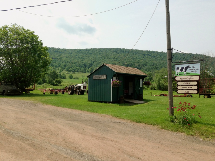 Crossing over Fitch’s Bridge to what is colloquially referred to as Back River Rd, this gently rolling road hugs the river back to Bloomville. Both Rt 10 and Back River Rd follow the river on opposite sides, but what Rt 10 is to traffic, Back River Rd is to farming: known as the West Branch Farm Trail, there is a higher density of roadside farm stands along this stretch than anywhere else in the county. There’s a farm stand on Back River Rd with raw milk gouda that I decided I wanted but it’s a few miles past Bloomville, so I continue past Bloomville on Back River Rd. After I slip the $6 in crumpled one dollar bills from my jersey pocket into the Folgers can and take my wedge from the fridge that appeared to be at least half a century old, I continue another mile or so and catch another tractor path shortcut to the Catskill trail and follow it for the remaining five miles back to Bloomville.