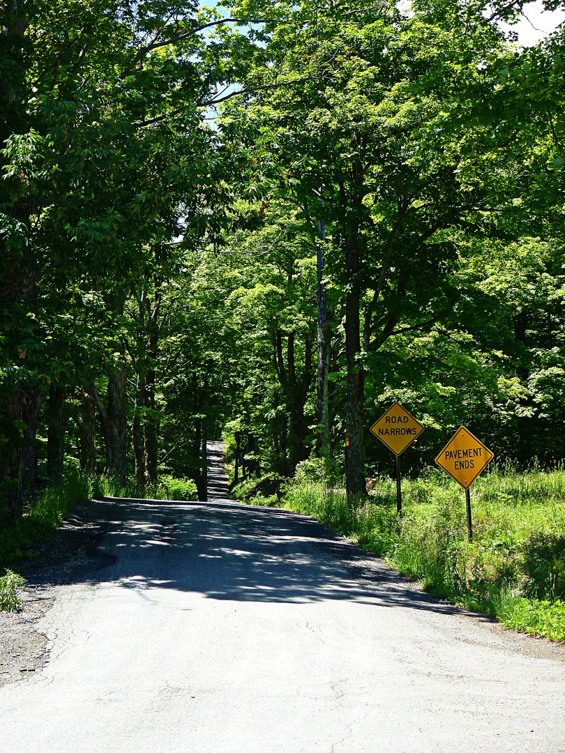 The trail follows Rt 10 with limited access points. About a mile into the trail, a tractor path provides a private cut-through back to Rt. 10. Across Rt. 10 from the tractor path is Kiff Brook Rd, a dirt road with a steady 4% grade over three miles, with a few short, steep climbs. Crumbling farms and hill-top residences dot the periphery. After the long, gradual climb, Kiff Brook Rd descends rapidly to its terminus at the bottom of a dramatic 16% descent on loose gravel. From there, a short segment of flat paved county highway connects to Roberts Rd, the second climb of the route. Here the road is chip-seal on top of the original red clay dirt, but I remember a time when it was still unpaved. Farms and bucolic pastureland line the road as it climbs steadily. As I near the top I look behind me and see a tractor cresting the previous hill behind me; it never catches up despite that I’m only averaging about 10 mph on this segment.