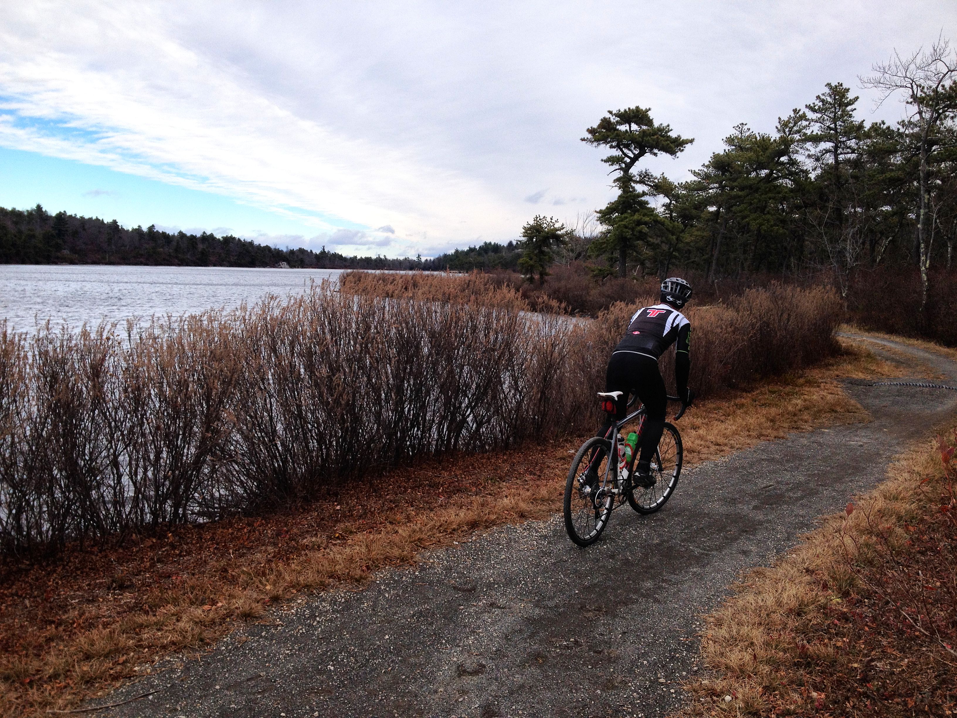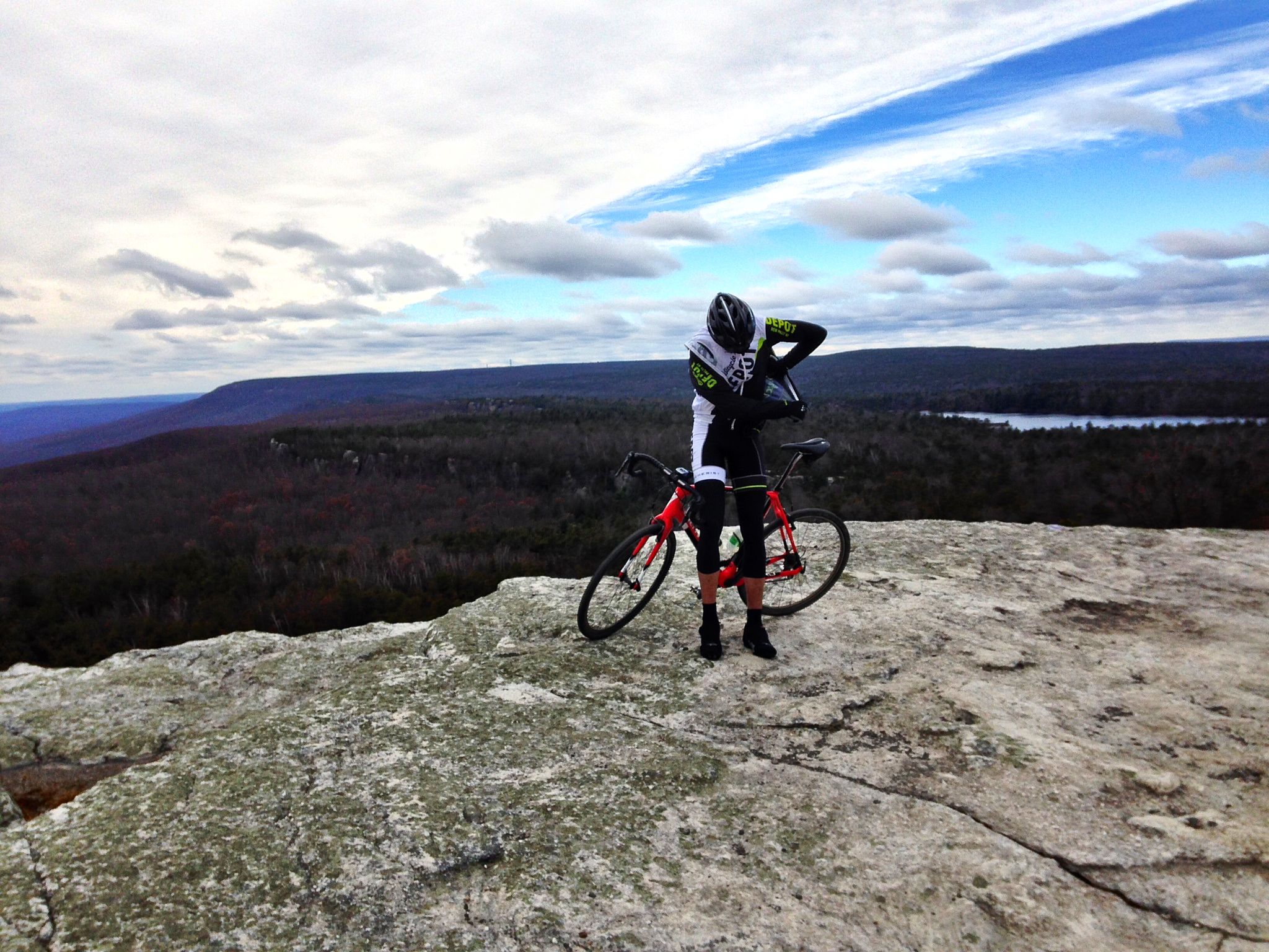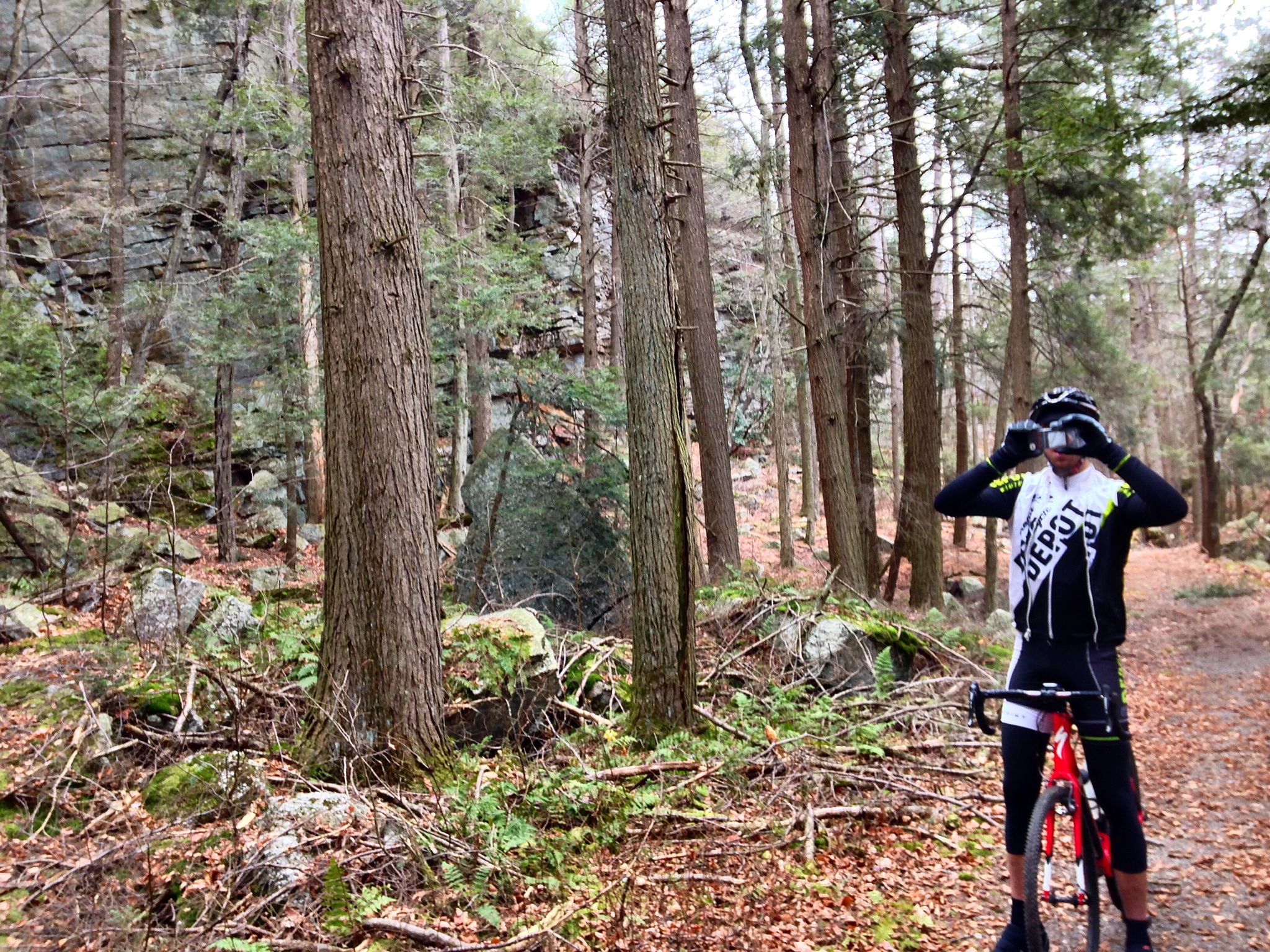 We rolled along the Castle Point carriage road, following the very edge of the cliff, toward Lake Minnewaska. This is a beautiful trail, but unforgiving of numb hands. We knew the trail well enough to descend at a good clip, but we had several discussions about how washing out on certain turns would leave you about a thousand feet below where you started.