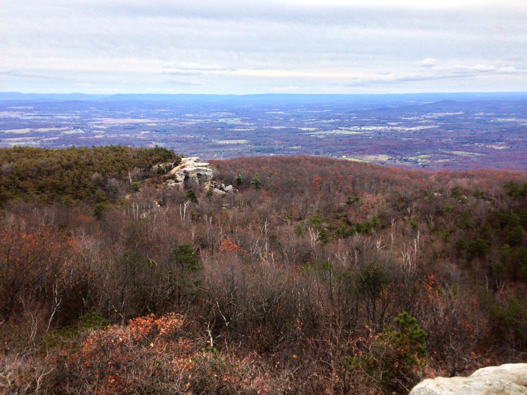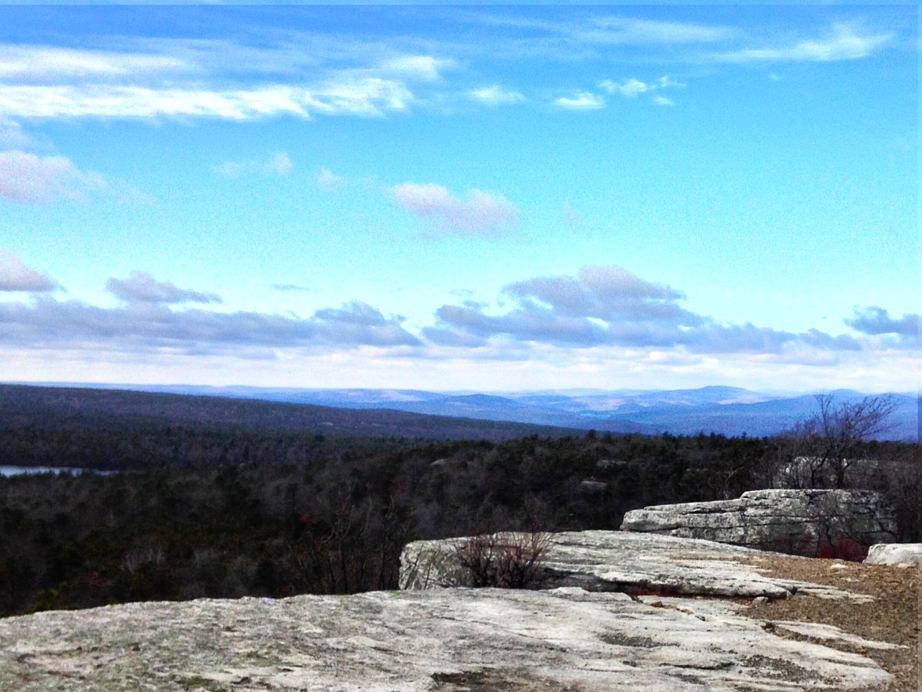 When we left New Paltz, temperatures were in the high 30s, and up to this point we had been climbing almost constantly, over 3000 feet in 18 miles. We were plenty warm, until we stopped to admire the view. Here at elevation, temperatures were in the 20s, and the wind was howling. There were patches of ice along the trail, and our bottles were frozen. We got cold fast, and we knew we had a good hour of descending ahead of us. We struggled into all of our previously shedded layers.