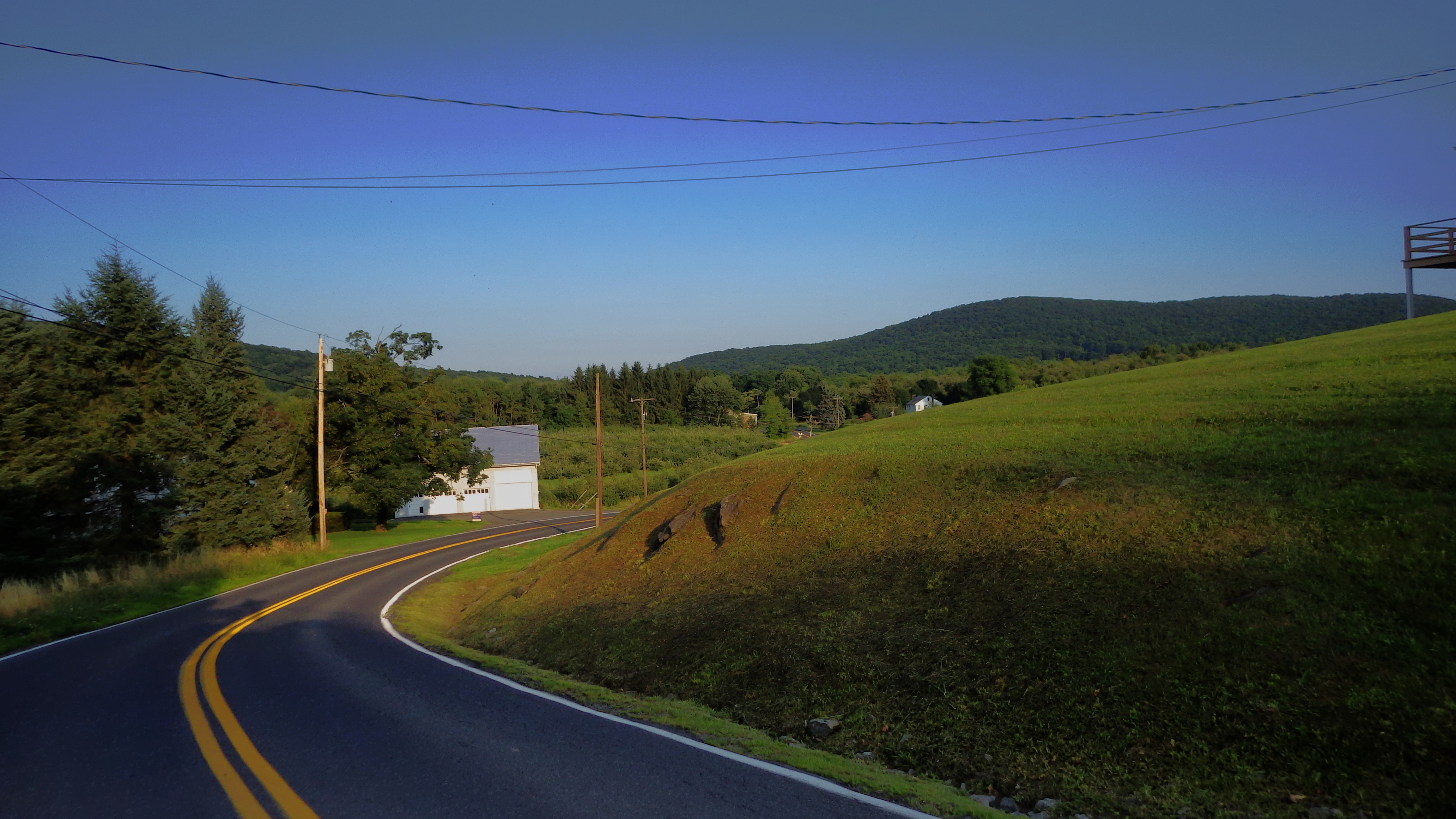 Fortuitously, the road work started at an intersection with Gray Road, another dirt road I hadn’t been on, but which had been on my radar for awhile. Gray Road would be my detour to Hamden, although it would eventually lead me to Route 10 closer to Delhi.  I’d have to ride on Route 10 for four miles back to Hamden–much less desirable than the planned route along Ridge Road to Launt Hollow Road, which would whisk me down five miles of smooth pavement all the way down to Hamden, avoiding the highway. Route 10 is hostile to cycling. A major 55-mph highway through the northern Catskills, it sees lots of truck traffic, and the shoulders are usually in rough shape, sections of which are completely unridable. Fist-sized chunks of broken asphalt litter the crumbling shoulder. When you see that fully laden logging truck fast approaching in your helmet-mounted rear-view, the idea of ‘taking the lane‘ is not very appealing! (I conjured this image a few minutes before arriving at Route 10, and sure enough– within a minute of turning onto 10, a loaded logging truck came barreling down the road, albeit in the opposite direction.)