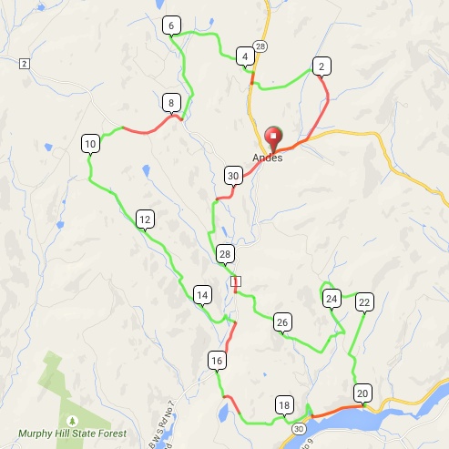 I was up in the Catskills for Memorial Day weekend, mostly to do yard work (yes, John F, home ownership is a ton of work!). Many of our mature garden plantings had gotten decimated over the winter, not directly because of the extreme cold but indirectly: the deer were desperate, and began eating plants they normally don’t prefer. I set aside enough time from my garden work to get one short ride in, one that I had mapped out one cold February day as the snow drifts imprisoned me in my house. I’ve written about Andes in my Tale of Three Hamlets post, but there is an abundance of dirt roads in the township that I haven’t explored. This short 31 mile route would explore many of them– 23 miles worth (dirt roads are annotated below in green), and add to my growing network of vetted dirt roads of Delaware County, which I track old-skool style with a marker and a big wall map. One day I will transpose it to one large digital map, and make it available to the public.
