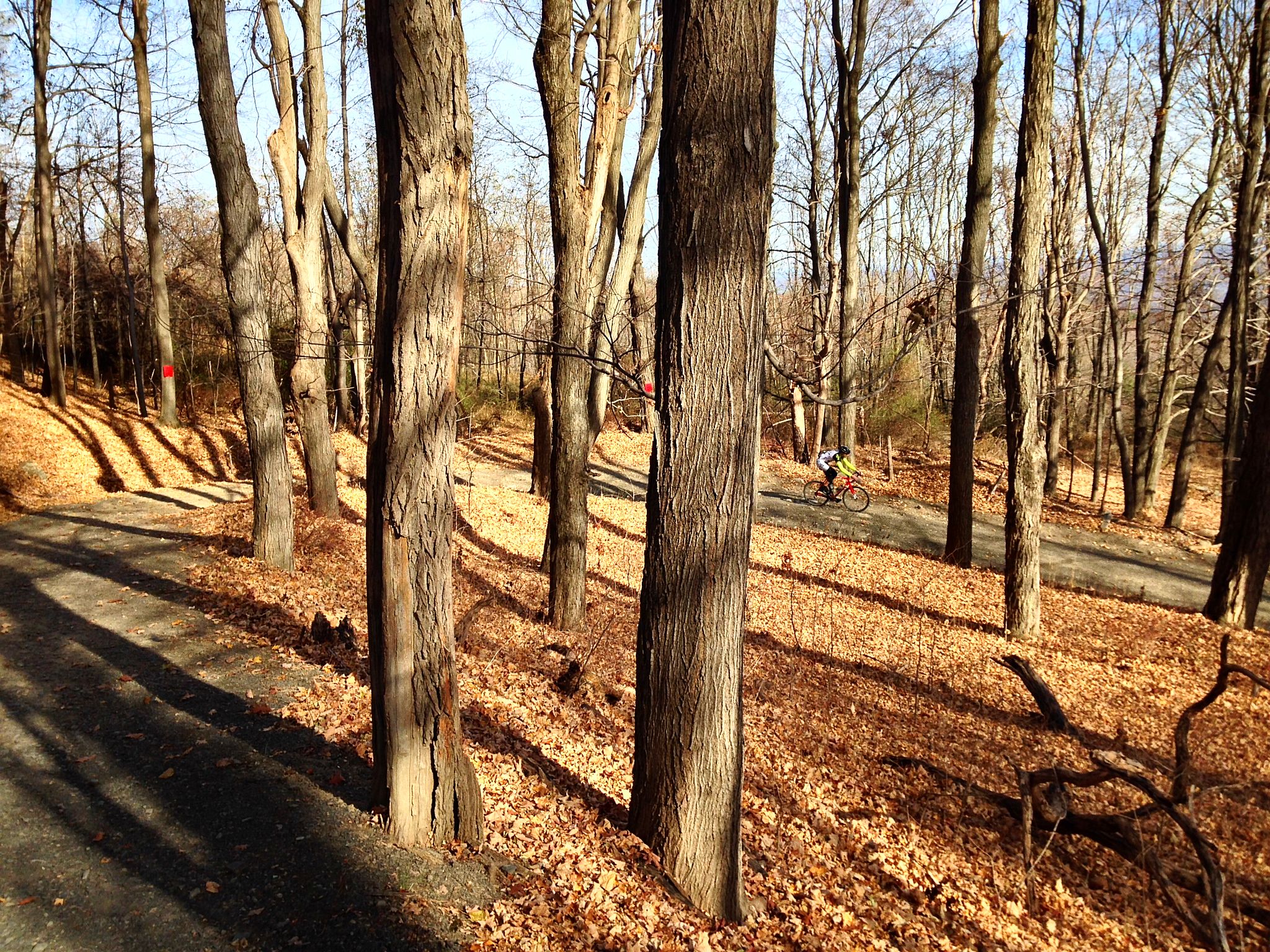 We then headed up Guyot Hill. This climb is one of the least-traveled roads in the Preserve, and in fact we almost blew past the turn because it was so deeply covered in leaves. This half-mile climb brought us to the highest elevation of our ride, although the views are limited because it’s woodsy all the way. From here it would be all downhill for the next 6 miles.